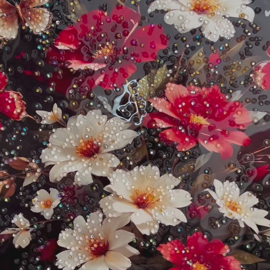 Ce tableau spectaculaire attire immédiatement le regard grâce à son effet de profondeur, ses fleurs éclatantes et ses papillons lumineux, comme figés en plein vol.